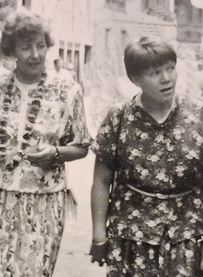 ![]() Oikealla Riitta Moilanen Tellervo Koiviston opastajana Kathmandussa, Patanin kujilla. |