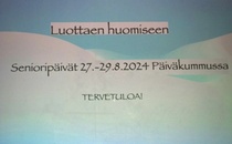Vuoden 2024 senioripäivät pidettiin 27.-29.8.2024 Päiväkummussa. Päivillä kuvaajana toimi Reijo Kaarto ja yhteiskuvat otti Olavi Vuori. Näpäyttämällä kuvaa näet sen vähän suurempana.